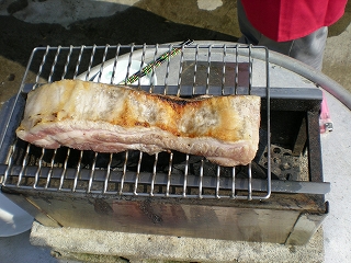豚バラ肉は長いため、ときどき炭火の上に手をかざし、火力の強いところ・弱いところがあれば、網を動かしたり場所を入れ替えたりしながら均一に火が通るように焼いていきましょう。 |